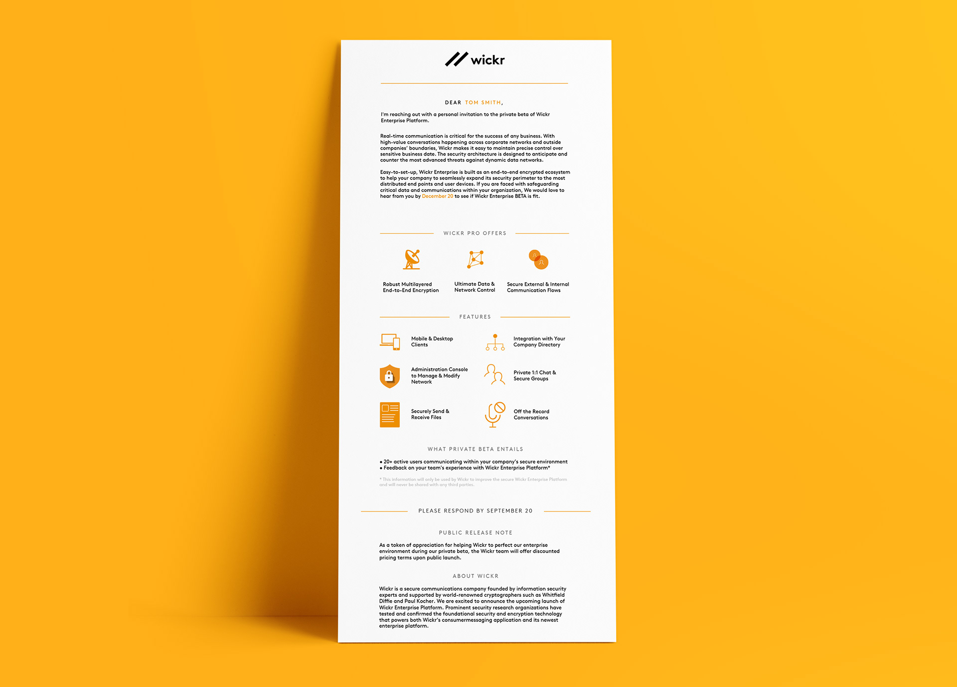 The Wickr instant messaging apps allow users to exchange end-to-end encrypted and content-expiring messages, including photos, videos, and file attachments and place end-to-end encrypted video conference calls.